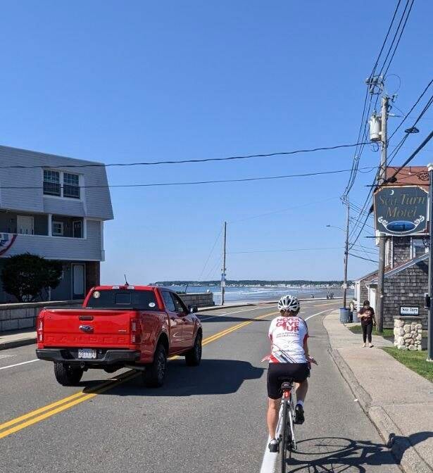 Mark seemed to be everywhere along this route just checking on us and snapping some pictures. Again, the coastal ride was magnificent but the heat was rising and taking a bit of a toll. We called another audible and added a rest stop at North Hampton Beach so we could get into some shade and dunk our heads in the outdoor shower. Charlie loved that the Beach Plum, with the best ice cream ever, was right across the street. The Beach Plum is a must stop on our frequent training rides up the coast and Charlie, being a rookie, got the biggest ice cream he could buy for $7.00! Foz,(Dave Foster) our fearless leader from last year would have been impressed. The ice cream was so big, and I knew we couldn't wait much longer to get back on the road. Thankfully, he took my suggestion to put it in one of the coolers so we could get back on the road and he could eat the rest at the next stop which was just about 5 miles down the road.
